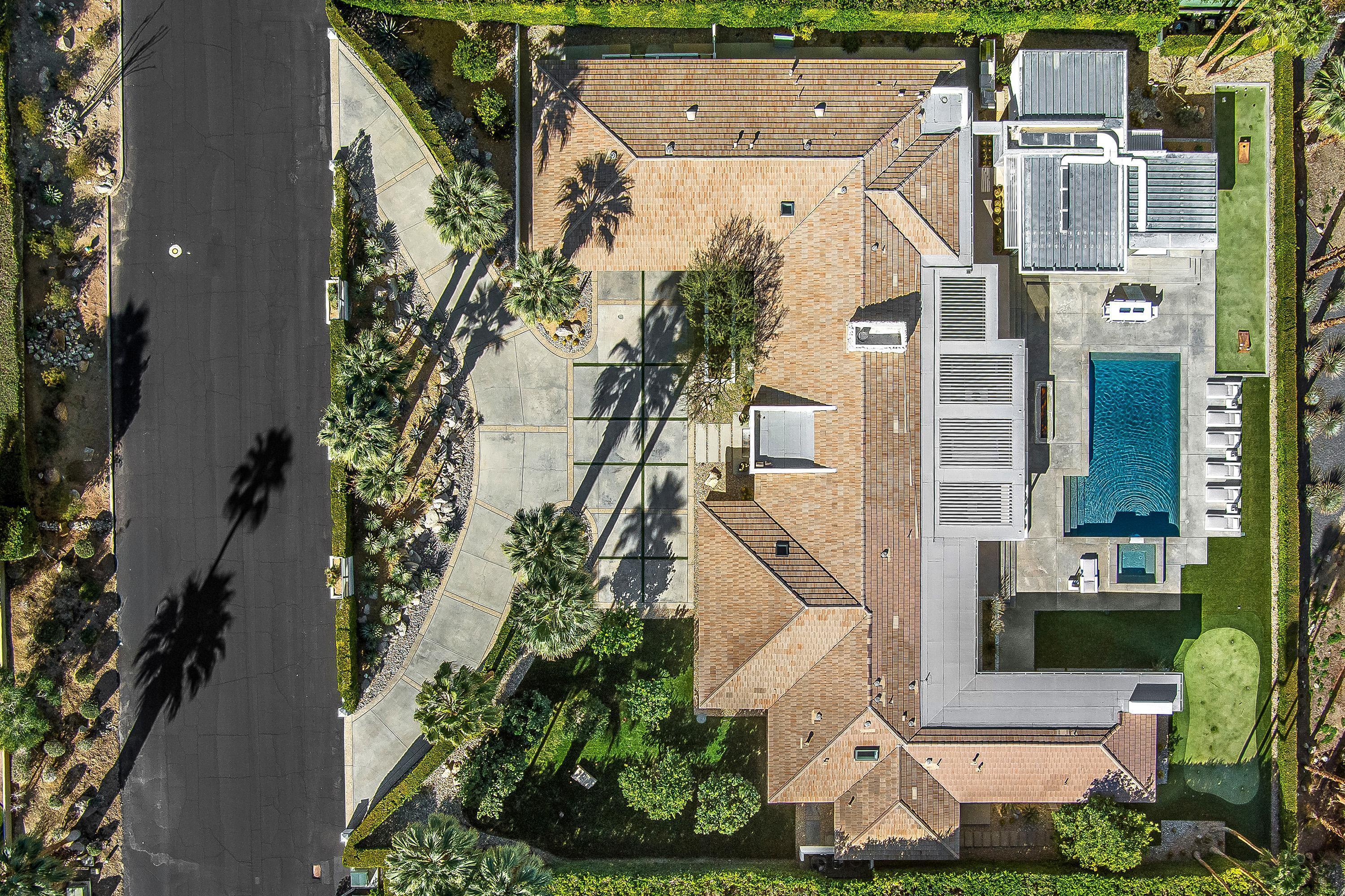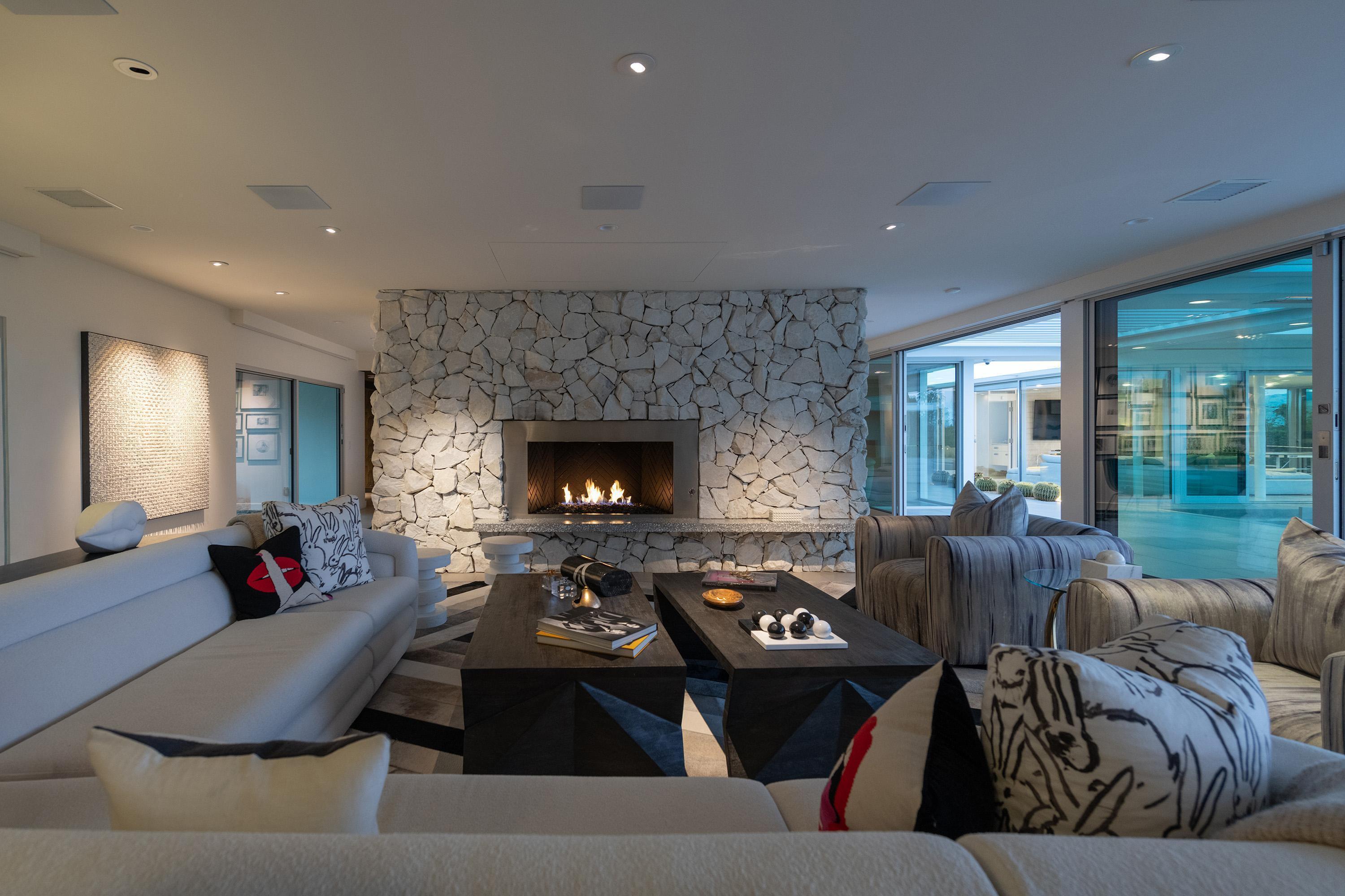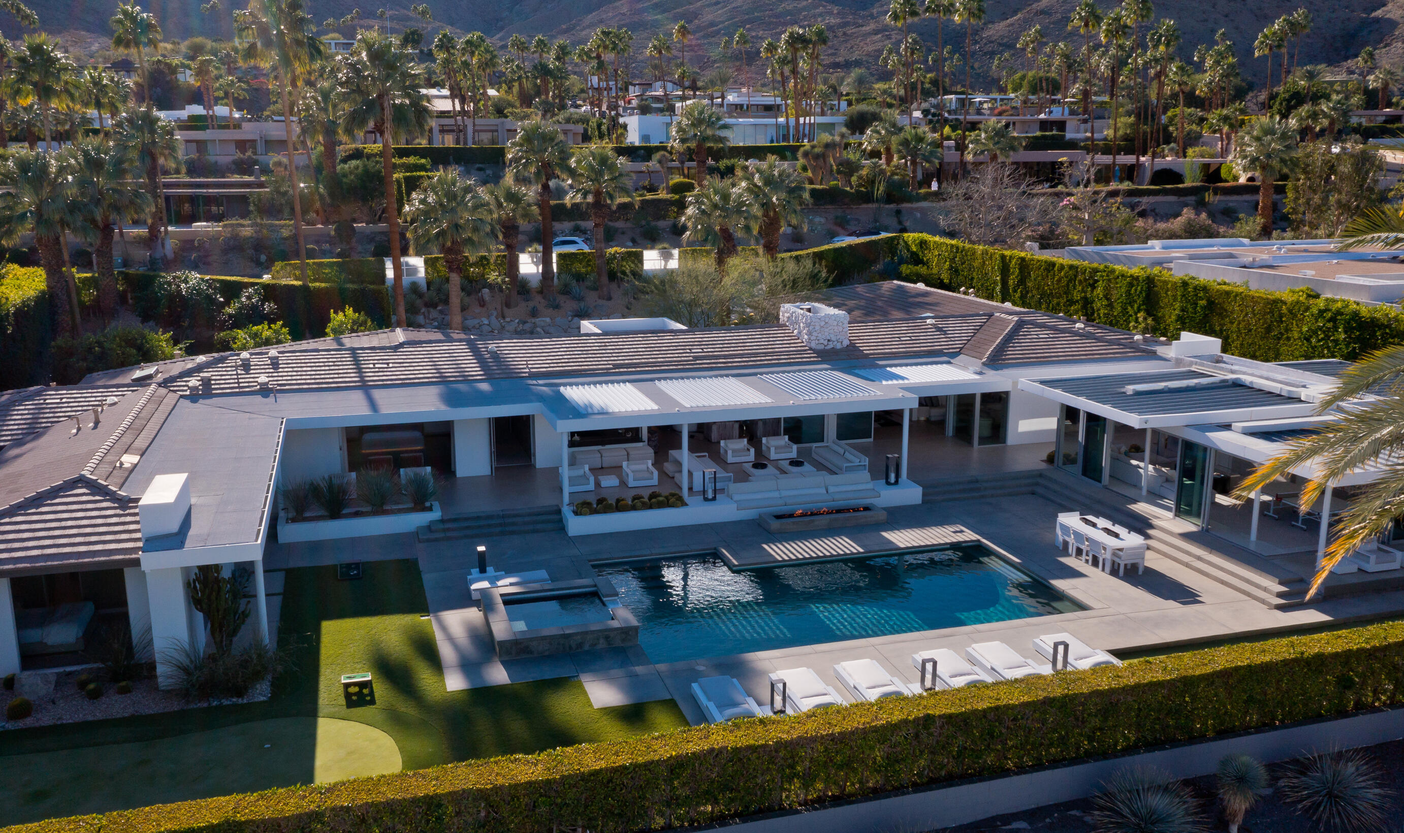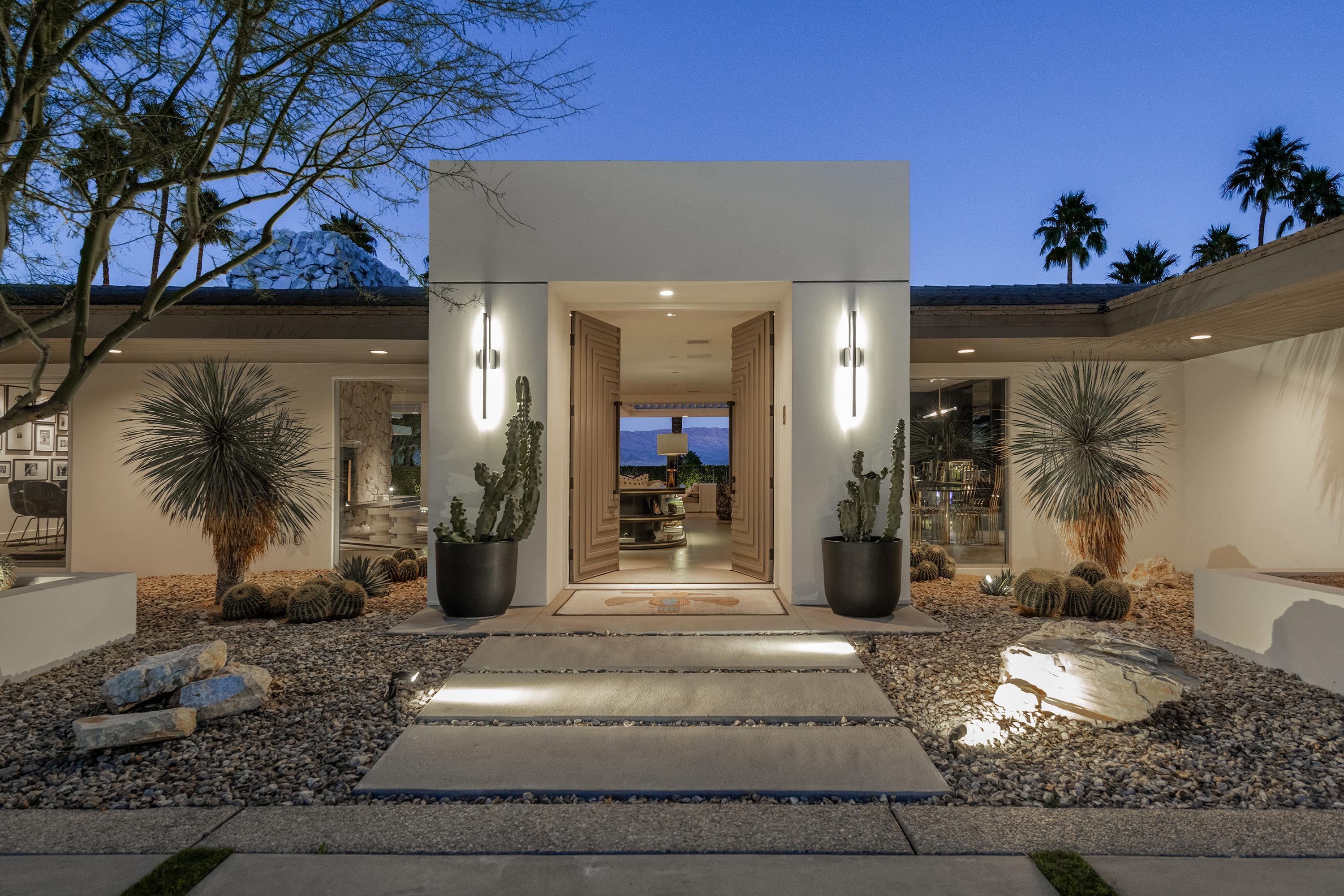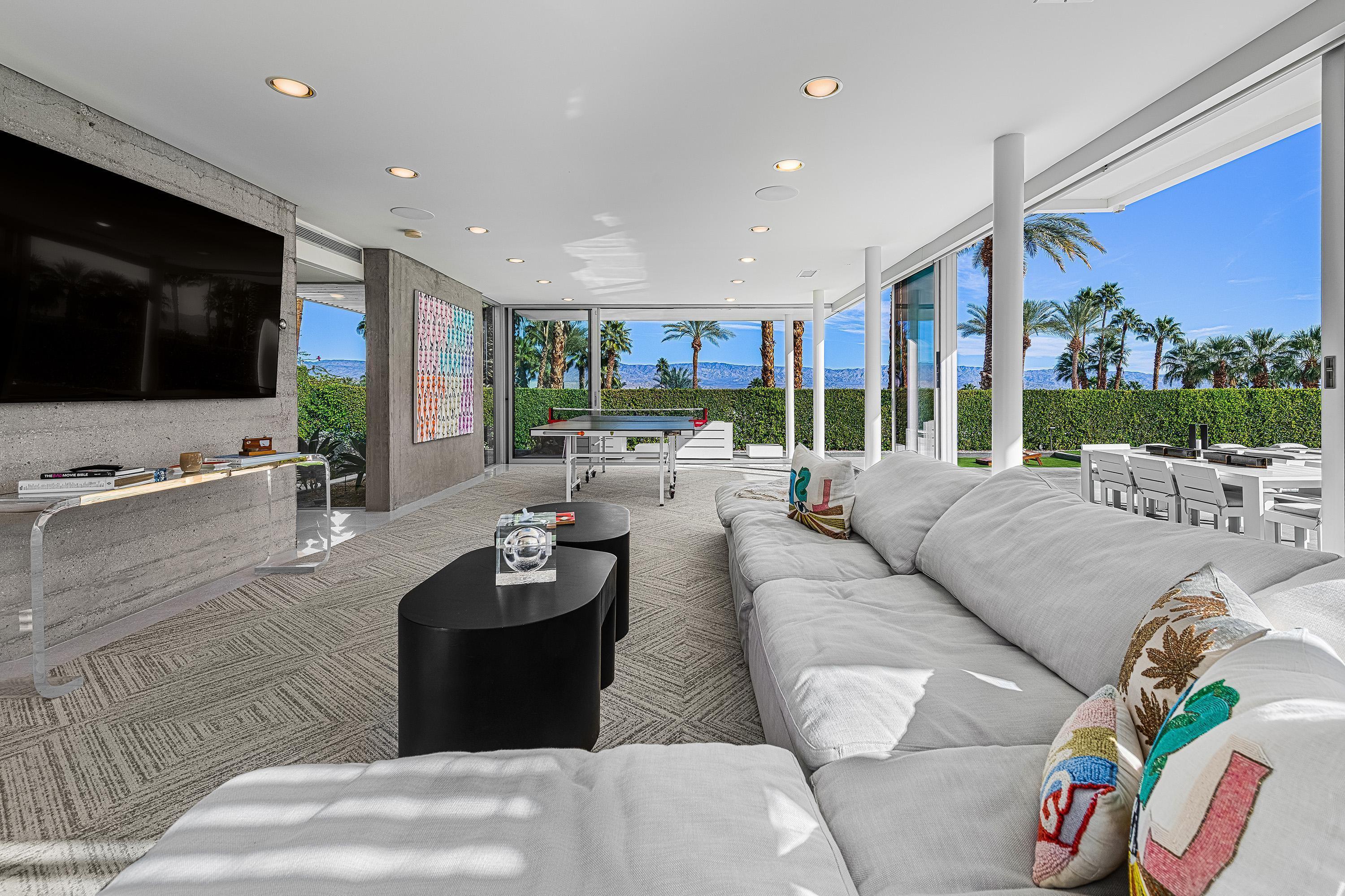 Perched high atop the exclusive Thunderbird Heights enclave, this extraordinary 6-bedroom, 7-bath residence offers 6,148 square feet of luxury living with a seamless blend of California ranch charm and mid-century modern sophistication. From the front, the home showcases its California ranch-style façade, while the rear opens into a private modern oasis—perfectly designed for indoor-outdoor living and entertaining. The home is fully renovated, every detail showcases the finest finishes, state-of-the-art appliances, smart home technology, and curated design. The expansive floor plan features multiple living and dining areas, a chef's kitchen, and generously sized bedrooms, each with an en-suite bath. Fleetwood doors and windows are integrated throughout—many retract fully to disappear into the architecture—blurring the line between indoors and outdoors, framing sweeping views, and flooding the home with natural light. The main living space is ideal for entertainers and sports enthusiasts. Four tastefully integrated televisions create the ultimate setting for game-day gatherings, movie nights, or multi-event viewing—all without compromising the home's elegant design. The property offers multiple outdoor spaces for relaxation and entertaining, including a well-appointed grilling and cooking area discreetly tucked away for seamless hosting. Whether enjoying al fresco dining or quiet moments poolside, the home's outdoor amenities elevate every occasion. Set within the historic Thunderbird Heights community, this property offers golf cart access to the legendary Thunderbird Country Club, while its elevated position provides privacy and panoramic vistas. This is desert luxury at its finest.