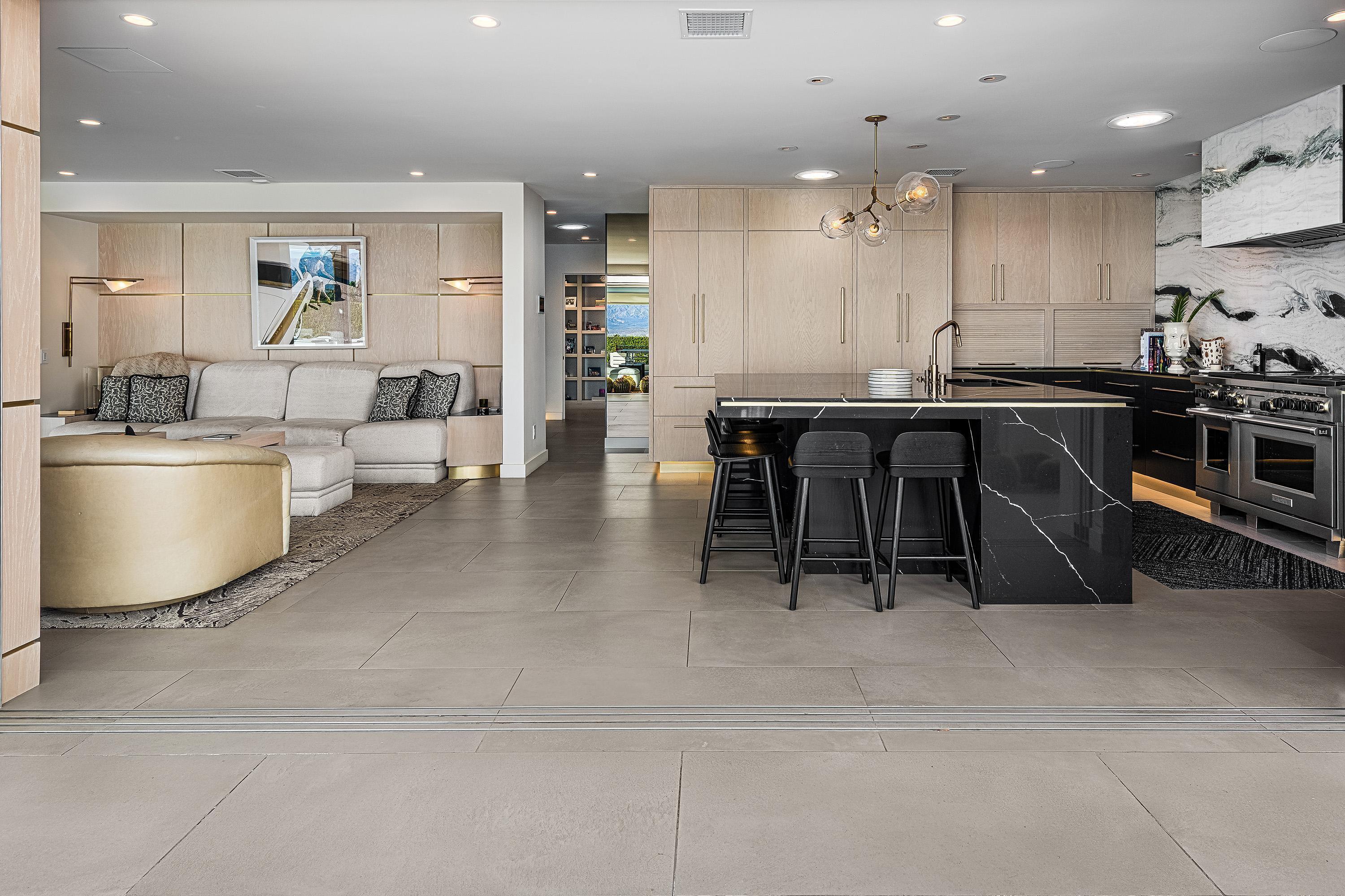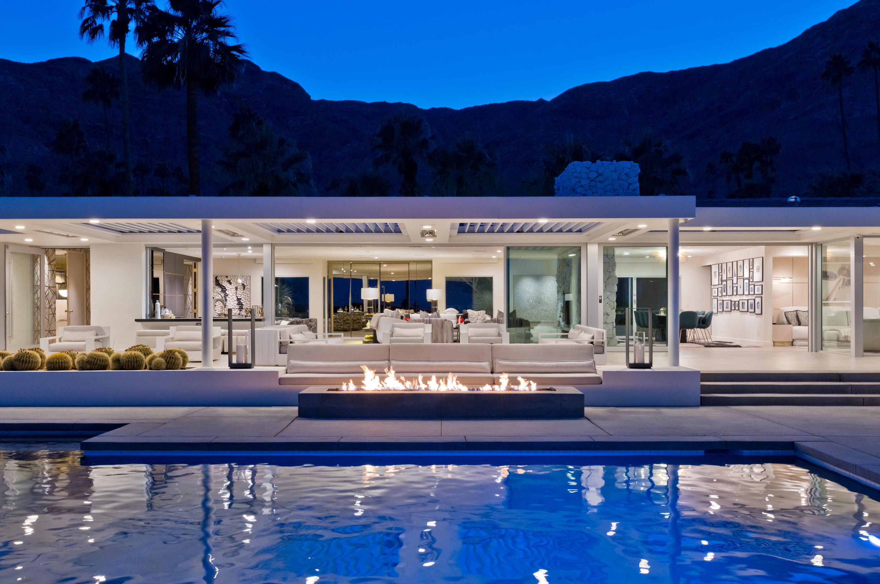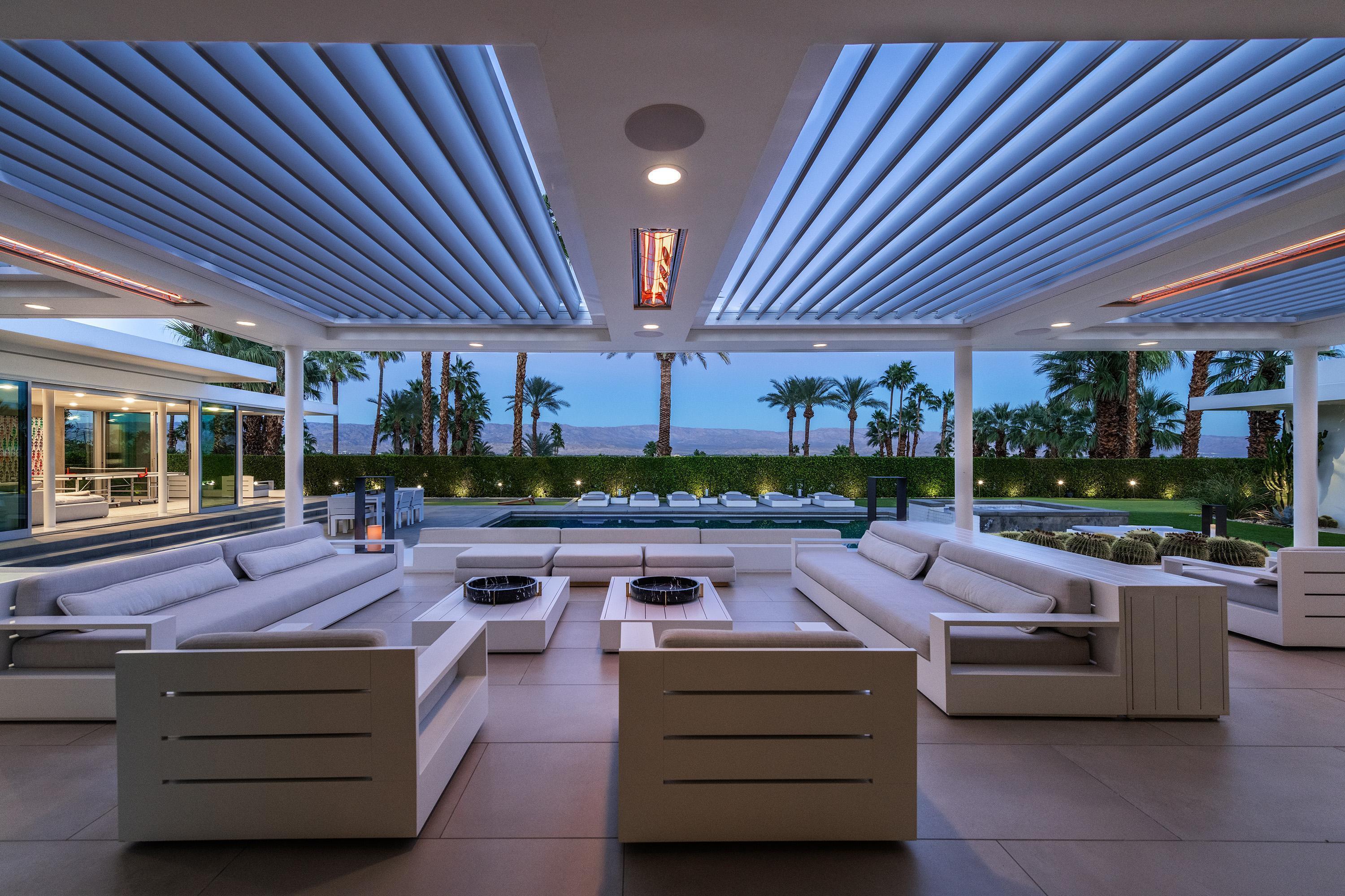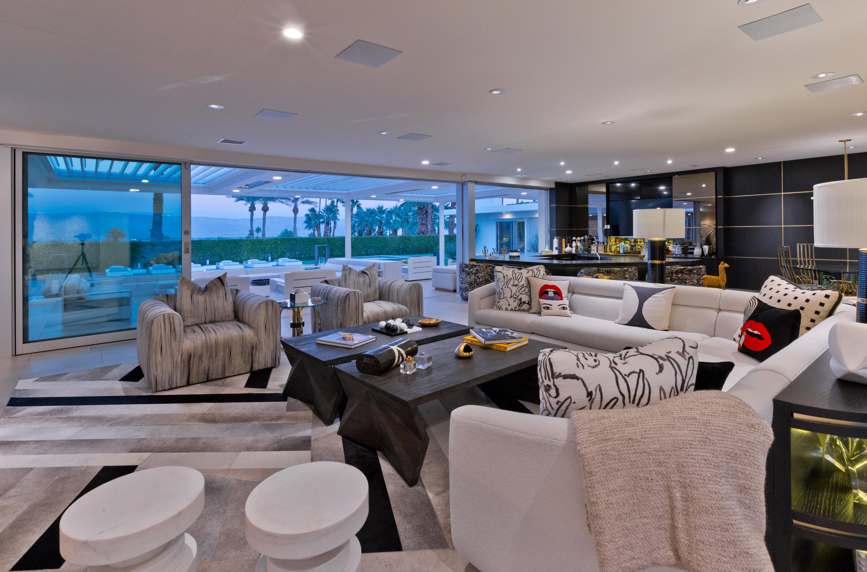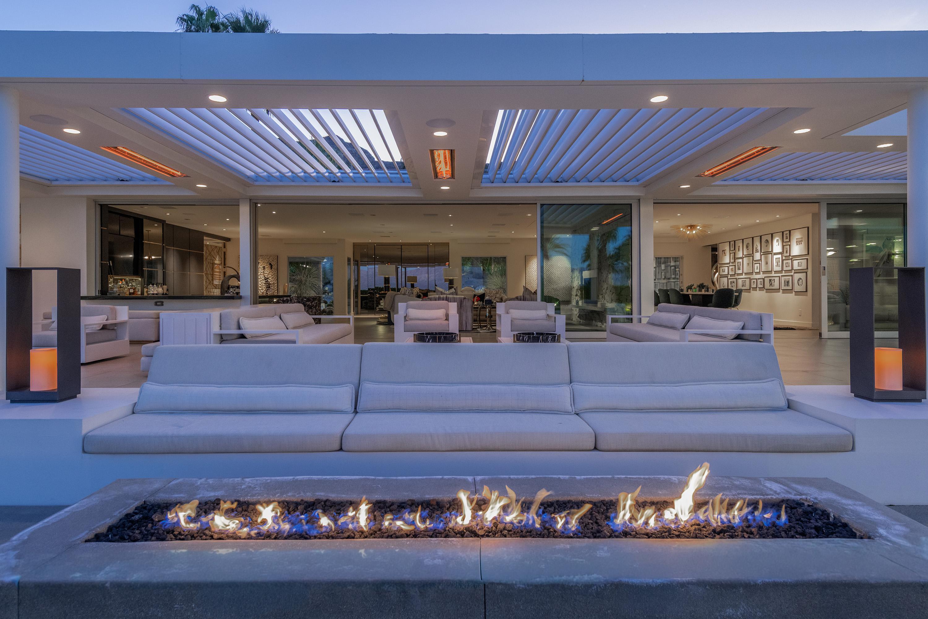 Perched high atop the exclusive Thunderbird Heights enclave, this extraordinary 6-bedroom, 7-bath residence offers 6,148 square feet of luxury living with a seamless blend of California ranch charm and mid-century modern sophistication. From the front, the home showcases its California ranch-style façade, while the rear opens into a private modern oasis—perfectly designed for indoor-outdoor living and entertaining. The home is fully renovated, every detail showcases the finest finishes, state-of-the-art appliances, smart home technology, and curated design. The expansive floor plan features multiple living and dining areas, a chef's kitchen, and generously sized bedrooms, each with an en-suite bath. Fleetwood doors and windows are integrated throughout—many retract fully to disappear into the architecture—blurring the line between indoors and outdoors, framing sweeping views, and flooding the home with natural light. The main living space is ideal for entertainers and sports enthusiasts. Four tastefully integrated televisions create the ultimate setting for game-day gatherings, movie nights, or multi-event viewing—all without compromising the home's elegant design. The property offers multiple outdoor spaces for relaxation and entertaining, including a well-appointed grilling and cooking area discreetly tucked away for seamless hosting. Whether enjoying al fresco dining or quiet moments poolside, the home's outdoor amenities elevate every occasion. Set within the historic Thunderbird Heights community, this property offers golf cart access to the legendary Thunderbird Country Club, while its elevated position provides privacy and panoramic vistas. This is desert luxury at its finest.