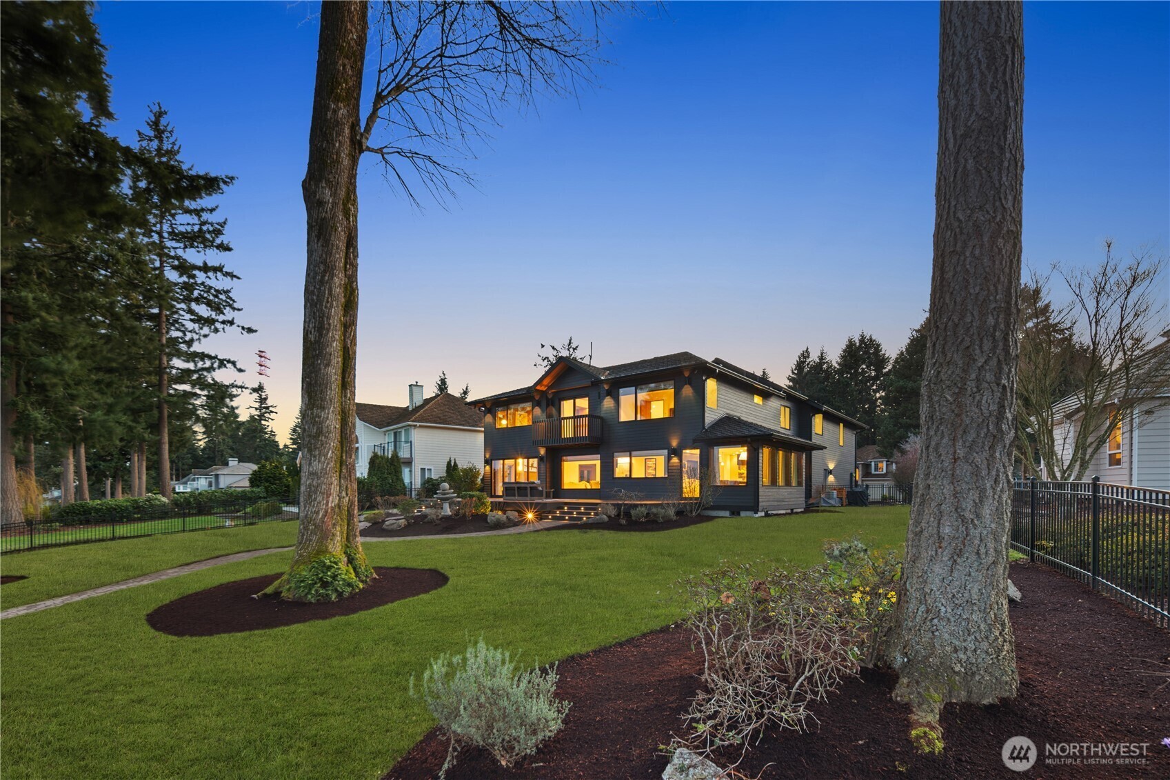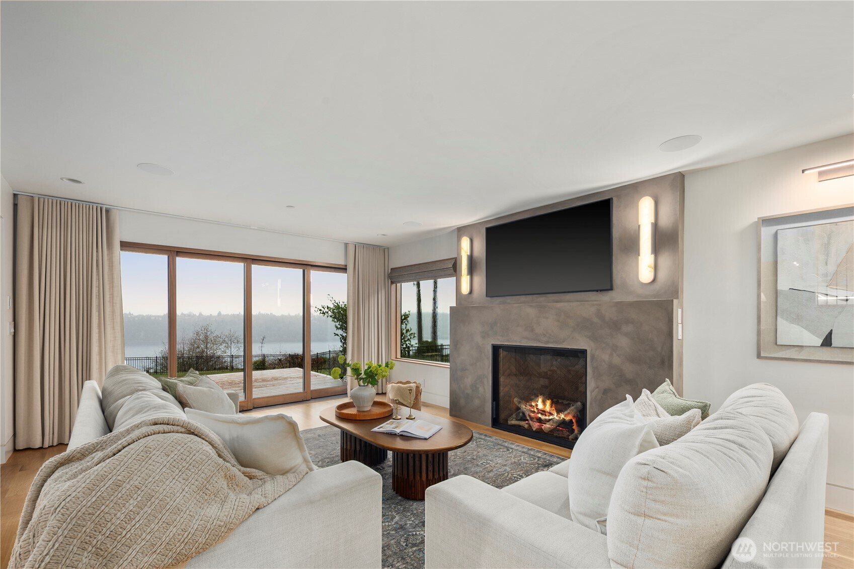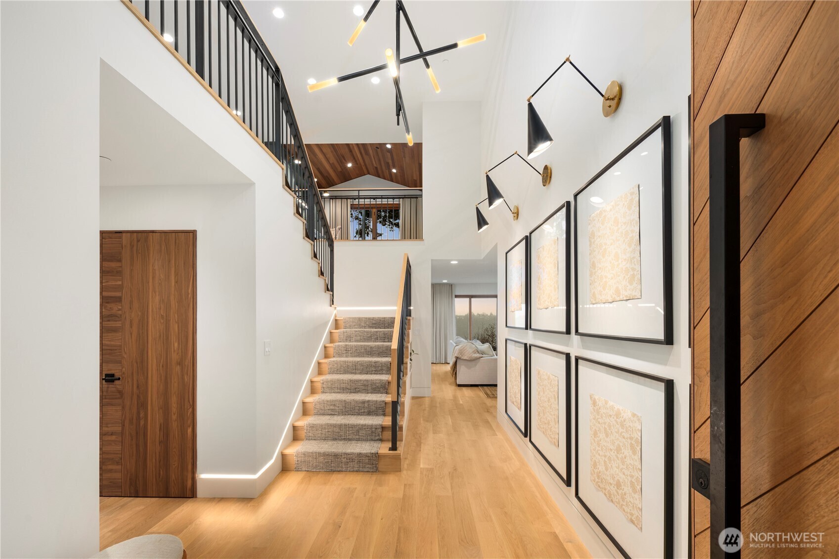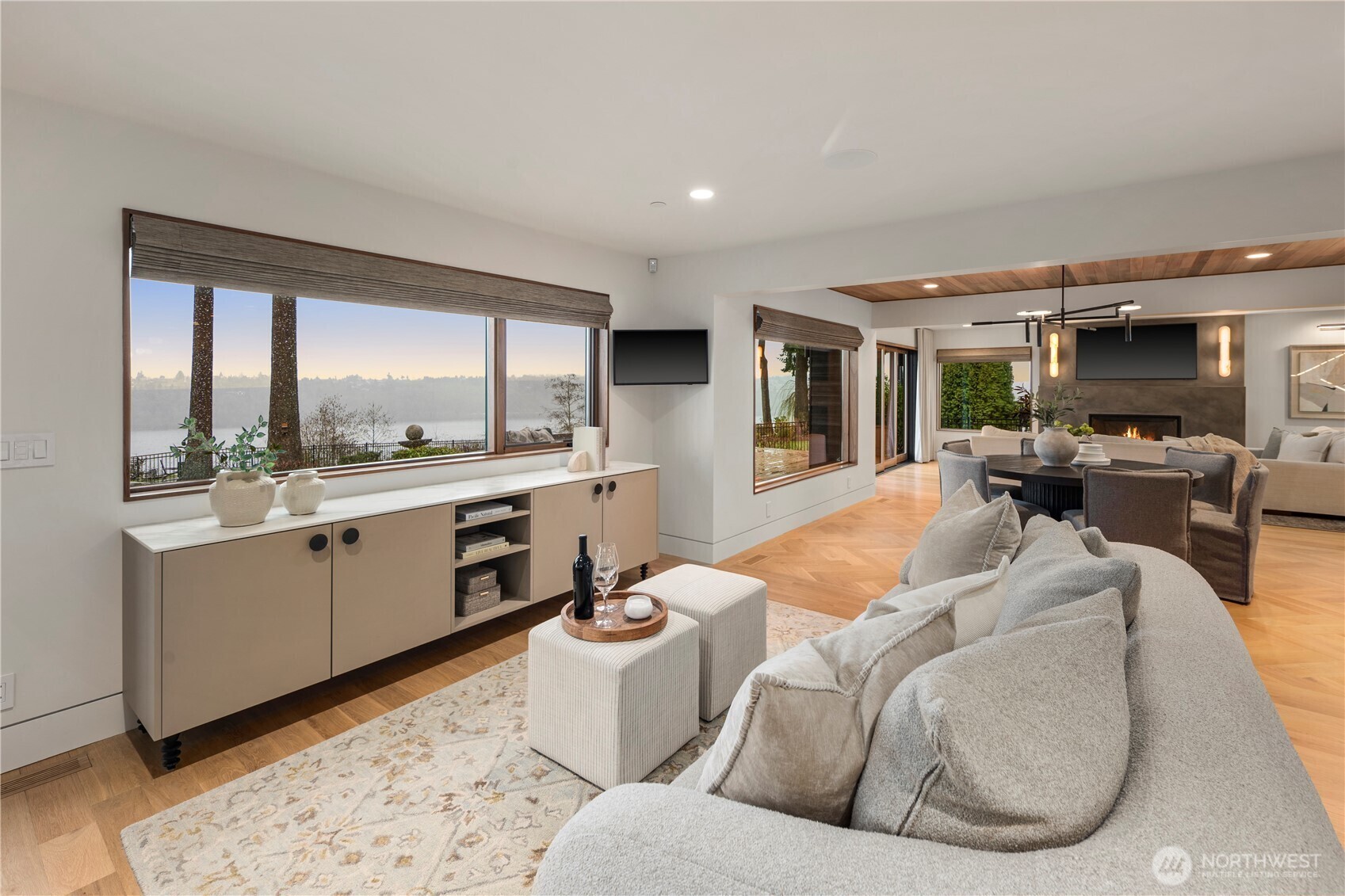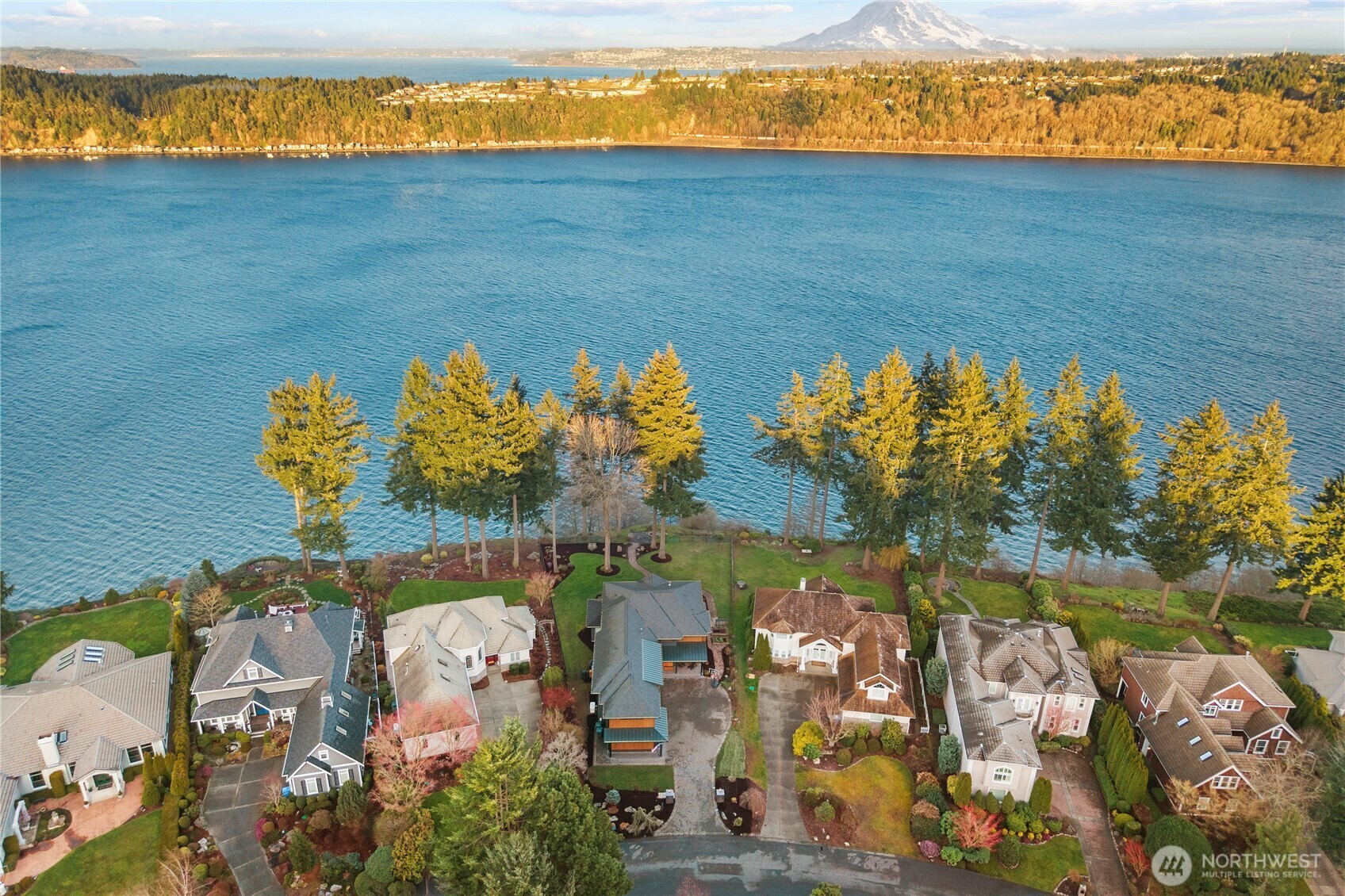 Rarely does a home of this caliber grace the Gig Harbor market. Perched on the bluff with sweeping views of Mount Rainier and the water—this home is a true modern masterpiece. Blending clean architectural lines with warm natural materials, it's both striking and inviting. No expense has been spared and no detail overlooked in the thoughtful design and craftsmanship throughout. Walnut-wrapped windows & doors, white oak hardwoods and cedar plank ceilings are just the beginning. The main level offers seamless spaces for living and entertaining—anchored by a stunning chef’s kitchen with premium appliances, expansive porcelain island, walk-in pantry, and designer lighting. Enjoy a tailored breakfast nook and dining area + wine room highlighting dramatic views and refined finishes. A main-level office showcases moody bespoke touches and custom cabinetry. Upstairs, the exquisite primary suite captures breathtaking views and features a spa-inspired bath, sophstone tub & impressive custom closet. Three additional bedrooms offer beautifully thoughtful storage & shared full bathroom. Best yet, a private retreat space with cedar-clad ceilings, bar area, and bath creates the ultimate lounge or media room—and a gym room just beyond. An additional upstairs office provides the perfect work-from-home setting. Custom expansive outdoor deck and a fully fenced yard complete this exceptional residence. Modern luxury, perfectly executed. None like it. This is elevated living at its finest.
