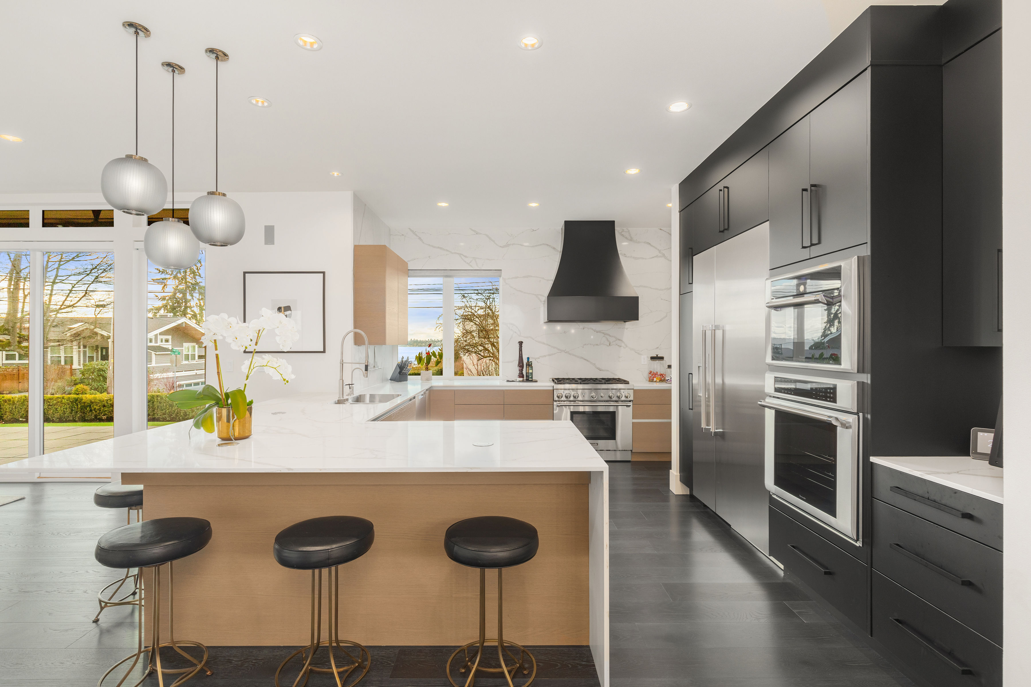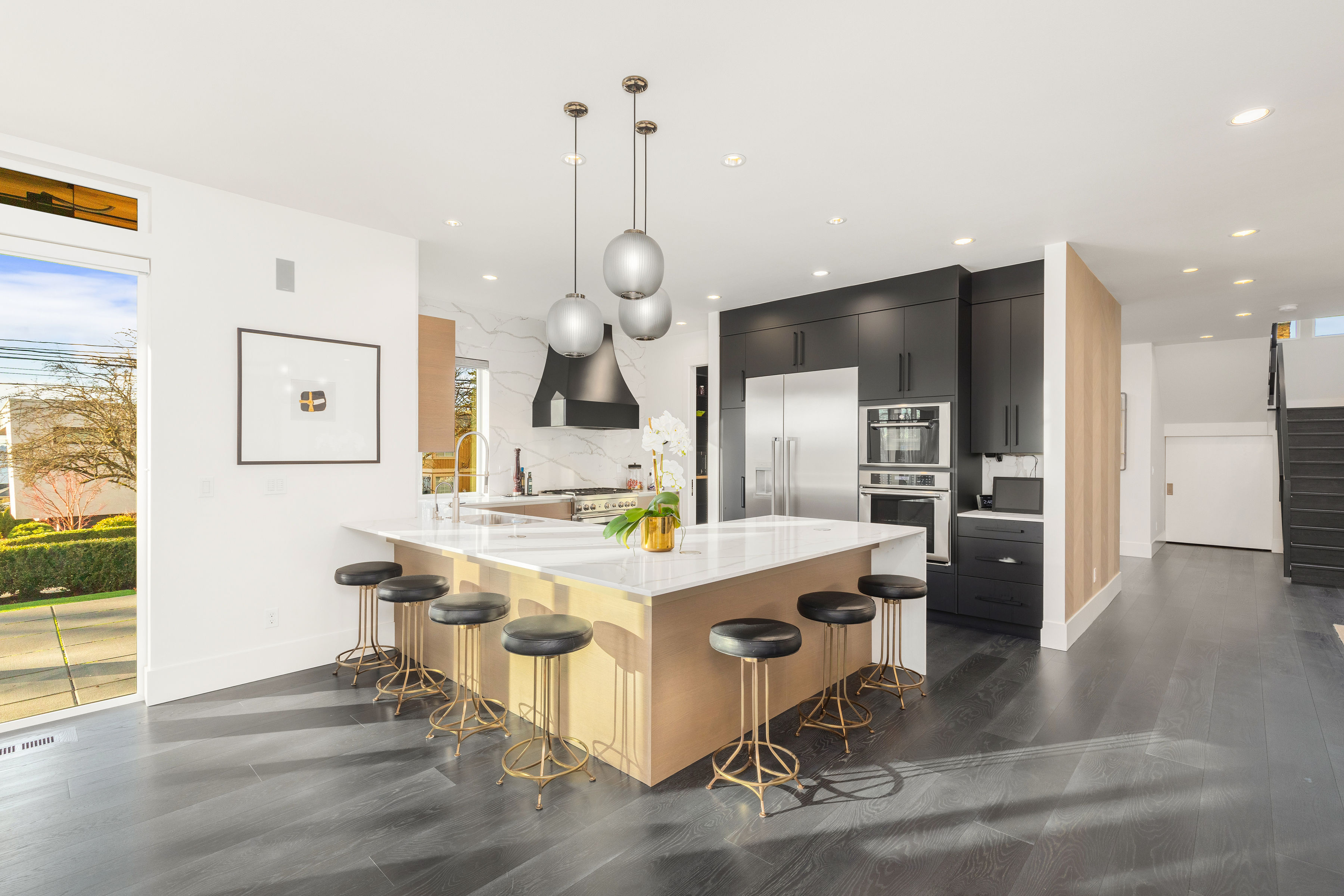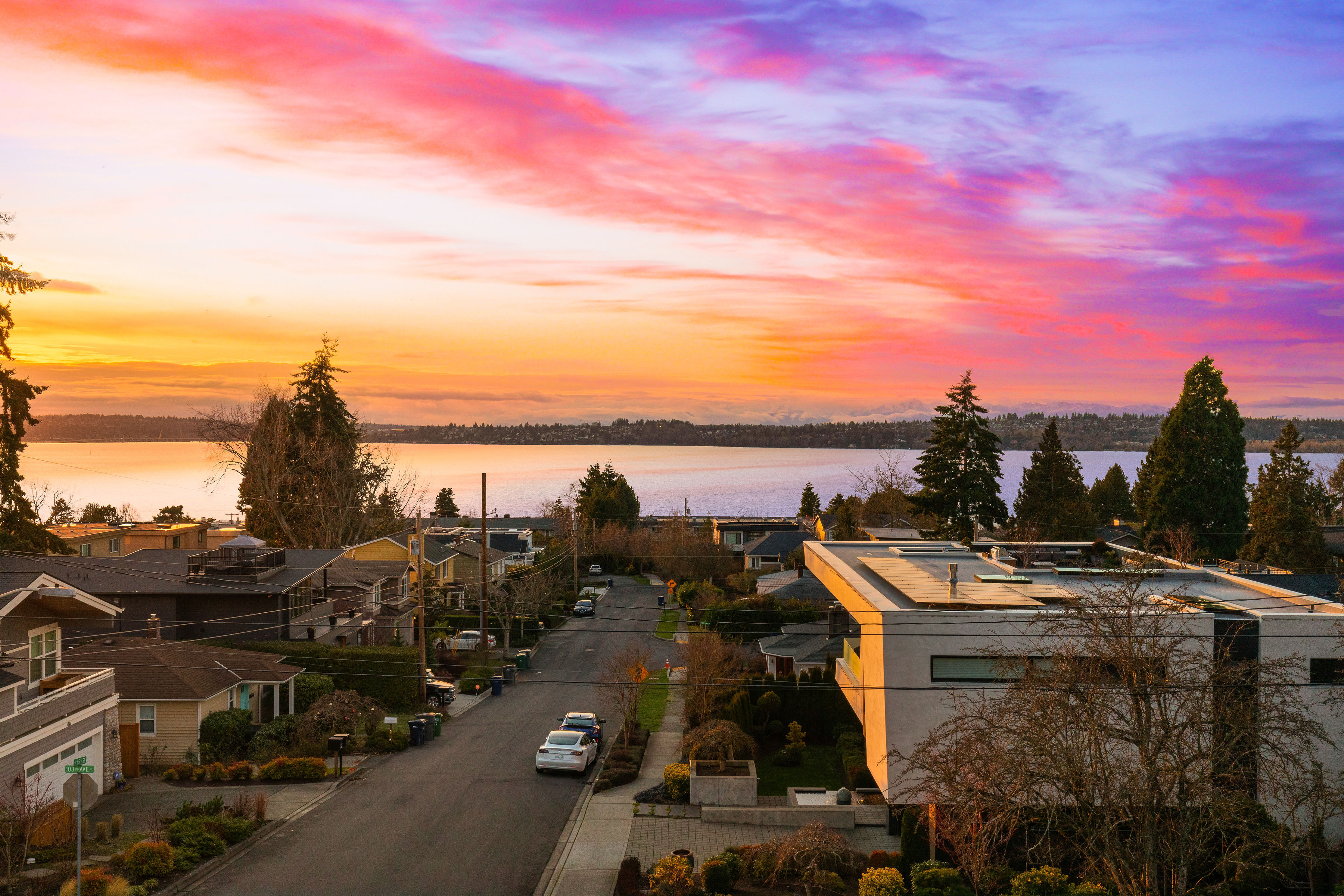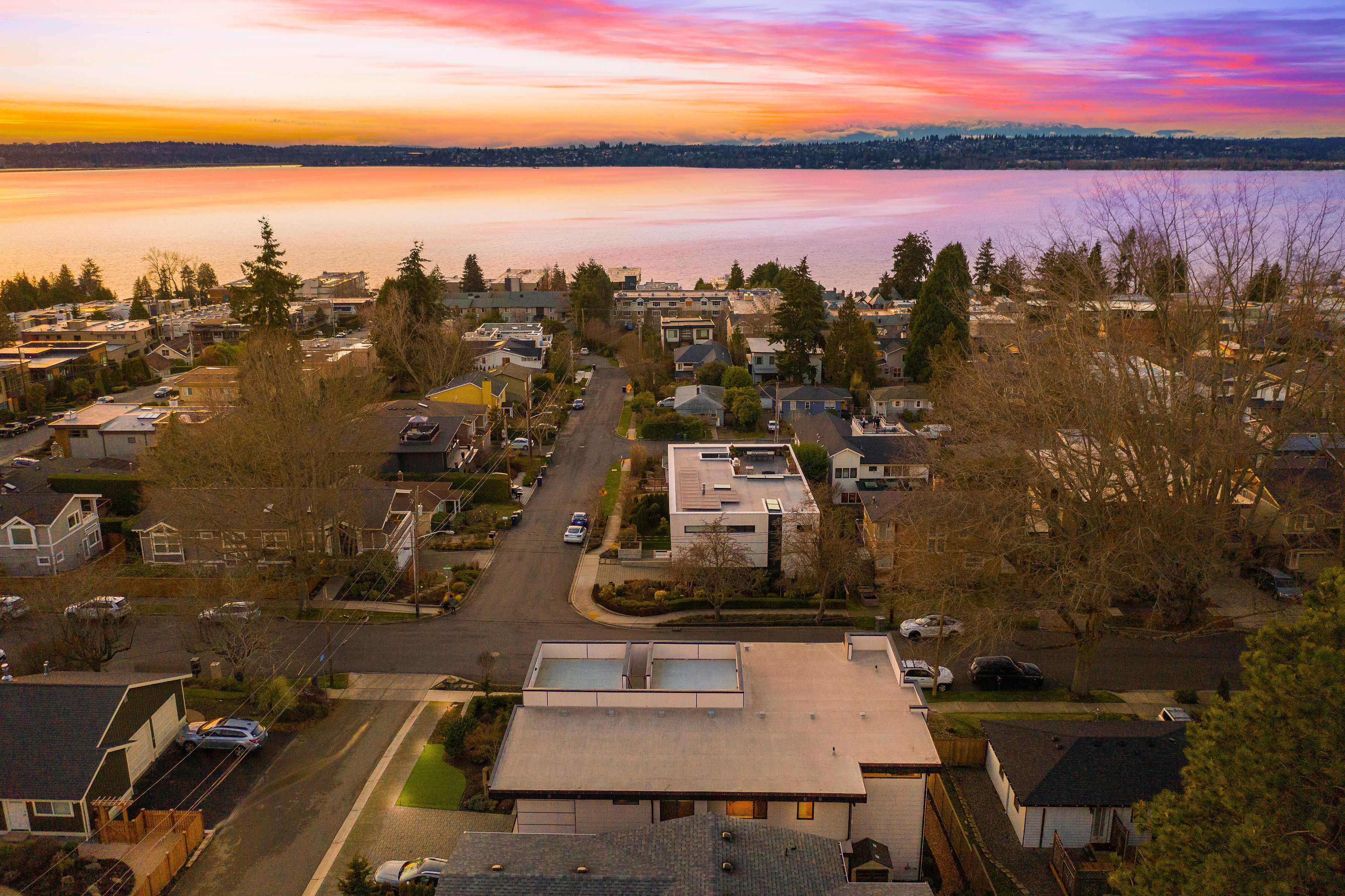 Timeless elegance meets bold design in this contemporary retreat, commanding attention with striking aesthetics and sweeping views. Set in desirable Houghton, just steps from Met Market & Lakeview Elementary. Rich black hardwoods anchor the main level, featuring a sleek chef’s kitchen with moody cabinetry, waterfall quartz island, & Thermador appliance suite with steam oven. Entertain in the expansive great room with linear gas fireplace & high-end audio system that flows to a heated view patio & turf yard. A dining room perfect for hosting, complemented by a guest suite, 3/4 bath, & private office. Upstairs find 3 en-suites including a luxurious primary with heated floors, dual shower, & absolutely giant closet. Access to a large view deck from primary & bonus room. Above it all, the rooftop deck offers stunning views of Lake Washington & Seattle skyline. Oversized 2 car garage wired for EV charging, elevator, hydronic heated floors, backup generator & fully motorized shades elevate everyday living in this exceptional home.