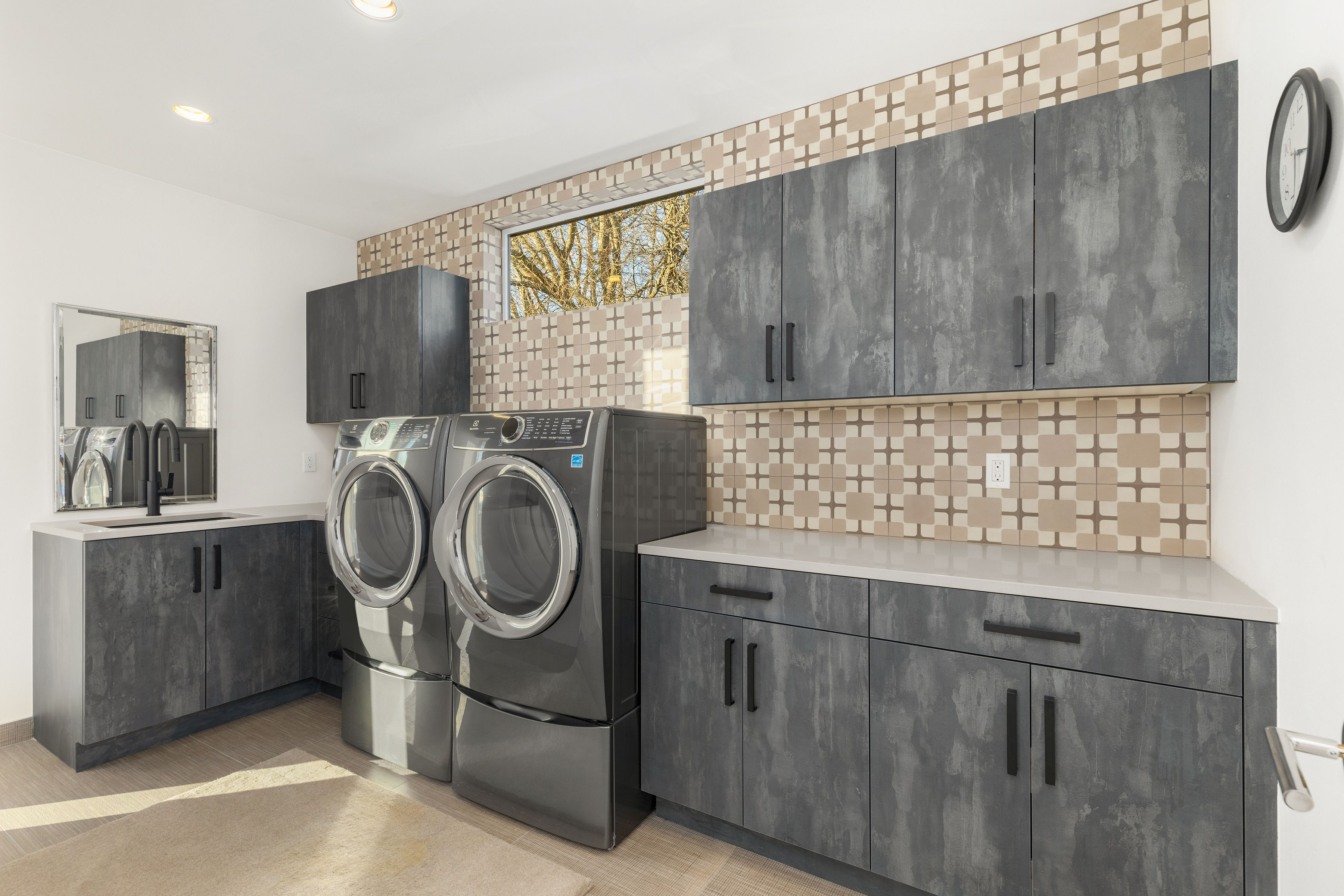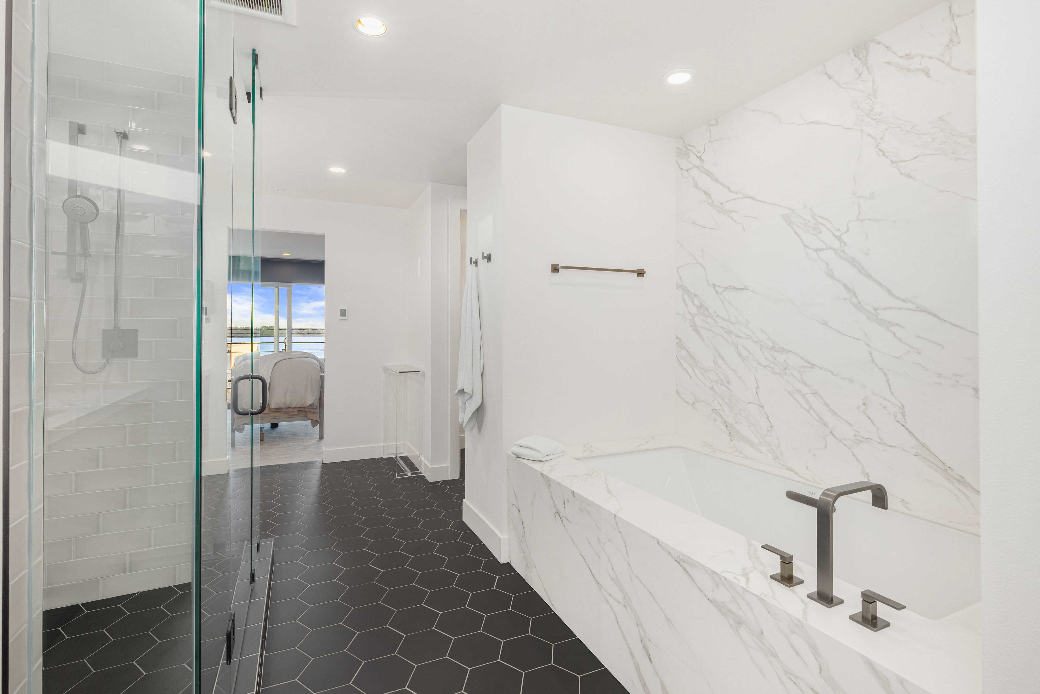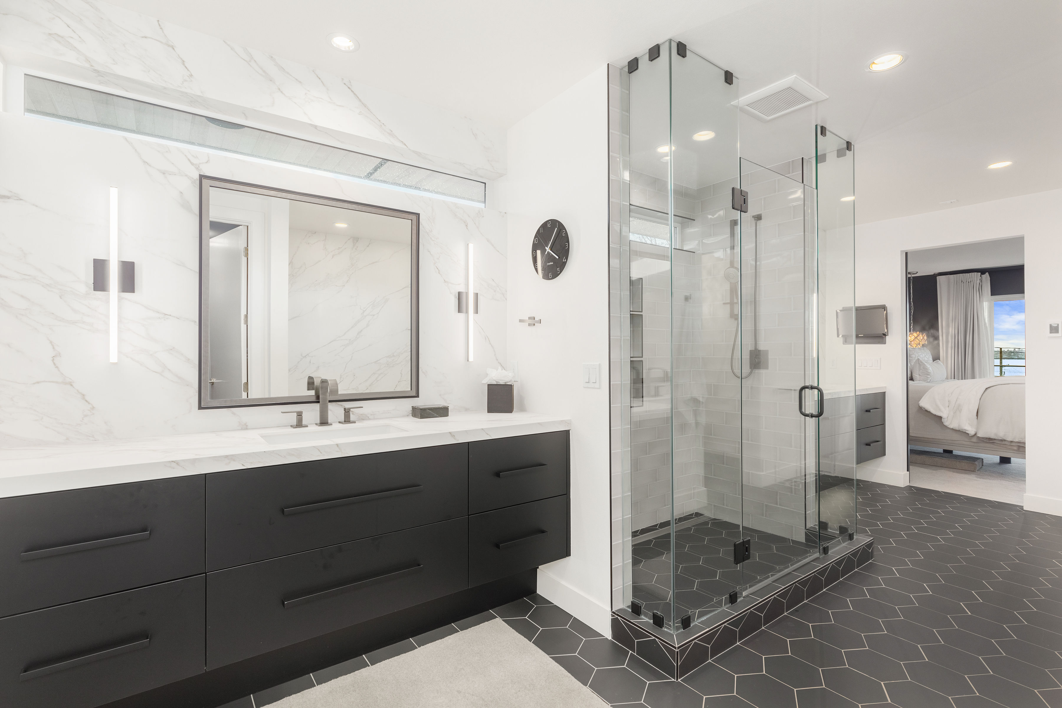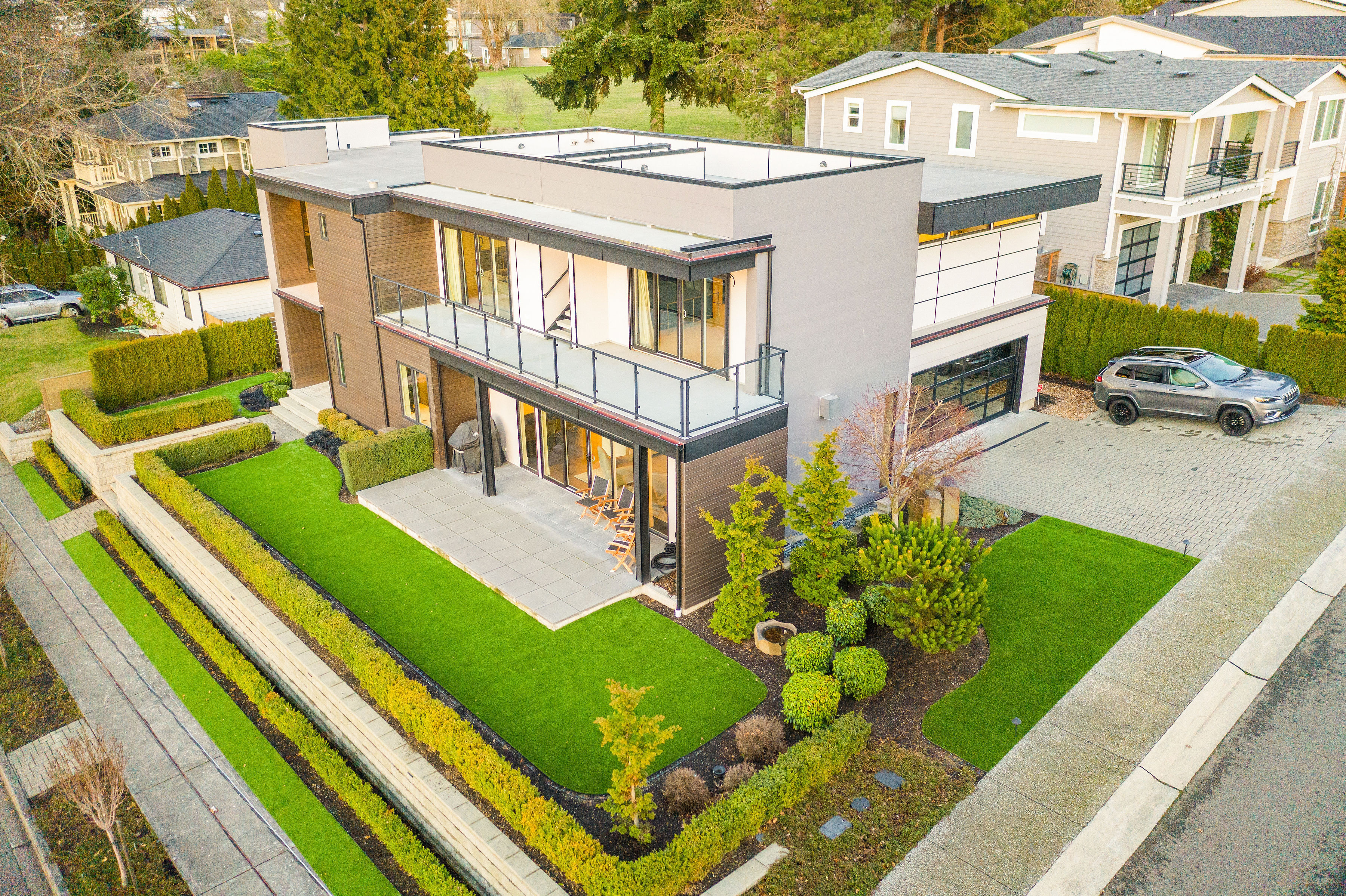 Timeless elegance meets bold design in this contemporary retreat, commanding attention with striking aesthetics and sweeping views. Set in desirable Houghton, just steps from Met Market & Lakeview Elementary. Rich black hardwoods anchor the main level, featuring a sleek chef’s kitchen with moody cabinetry, waterfall quartz island, & Thermador appliance suite with steam oven. Entertain in the expansive great room with linear gas fireplace & high-end audio system that flows to a heated view patio & turf yard. A dining room perfect for hosting, complemented by a guest suite, 3/4 bath, & private office. Upstairs find 3 en-suites including a luxurious primary with heated floors, dual shower, & absolutely giant closet. Access to a large view deck from primary & bonus room. Above it all, the rooftop deck offers stunning views of Lake Washington & Seattle skyline. Oversized 2 car garage wired for EV charging, elevator, hydronic heated floors, backup generator & fully motorized shades elevate everyday living in this exceptional home.